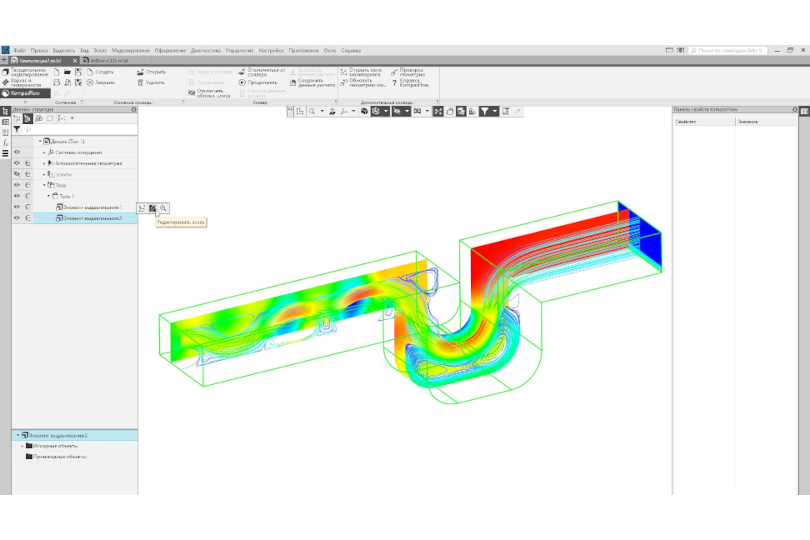 KompasFlow поможет определить действующие на изделие силы и моменты, структуру течения внутри или вокруг изделия, оценить перепад давления, полного давления или температуры; оценить варианты исполнения конструкции и отбросить неподходящие.